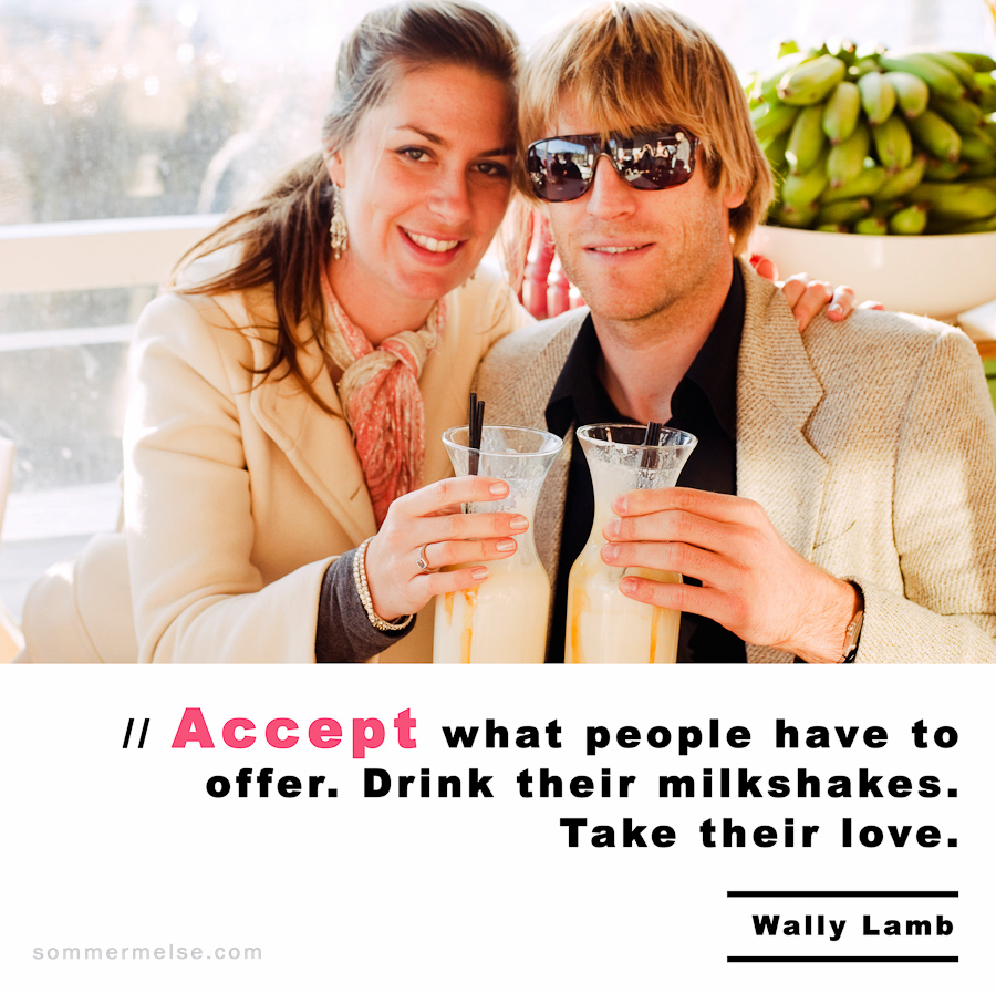 Quote // Accept what people have to offer. Drink their milkshakes. Take their love – Wally Lamb September 7, 2010 by sommer | 0 comment Leave a Reply Cancel replyYour email address will not be published. Required fields are marked *Comment *Name* Email * Website
