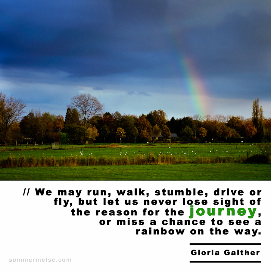 Quote //  We may run, walk, stumble, drive or fly, but let us never lose sight of the reason for the journey, or miss a chance to see a rainbow on the way – Gloria Gaither
