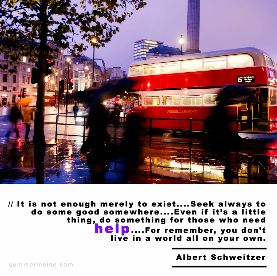Quote // It is not enough merely to exist….seek always to do some good somewhere…….even if its a little thing, do something for those who need help…..for remember, you don’t live in a world all on your own – Albert Schweitzer