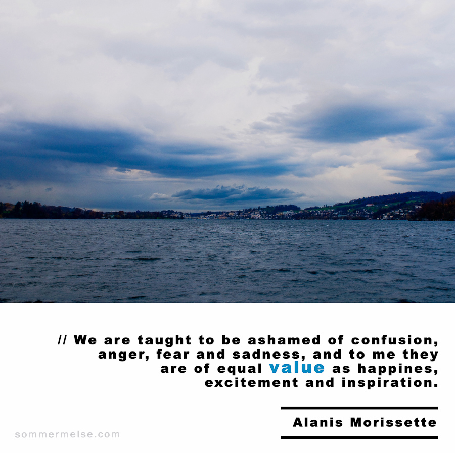 Quote // We are taught to be ashamed of confusion, anger, fear and sadness, and to me they are of equal value as happiness, excitement and inspiration – Alanis Morissette