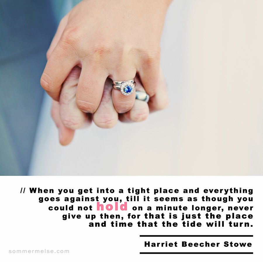 Visual Inspiration 365 - When you get into a tight place and everything goes against you until it seems that you cannot hold on for a minute longer, never give up then, for that is just the place and time when the tide will turn - Harriet Beecher StoweQuote // When you get into a tight place and everything goes against you, till it seems as though you could not hold on a minute longer, never give up then, for that is just the place and time that the tide will turn – Harriet Beecher Stowe