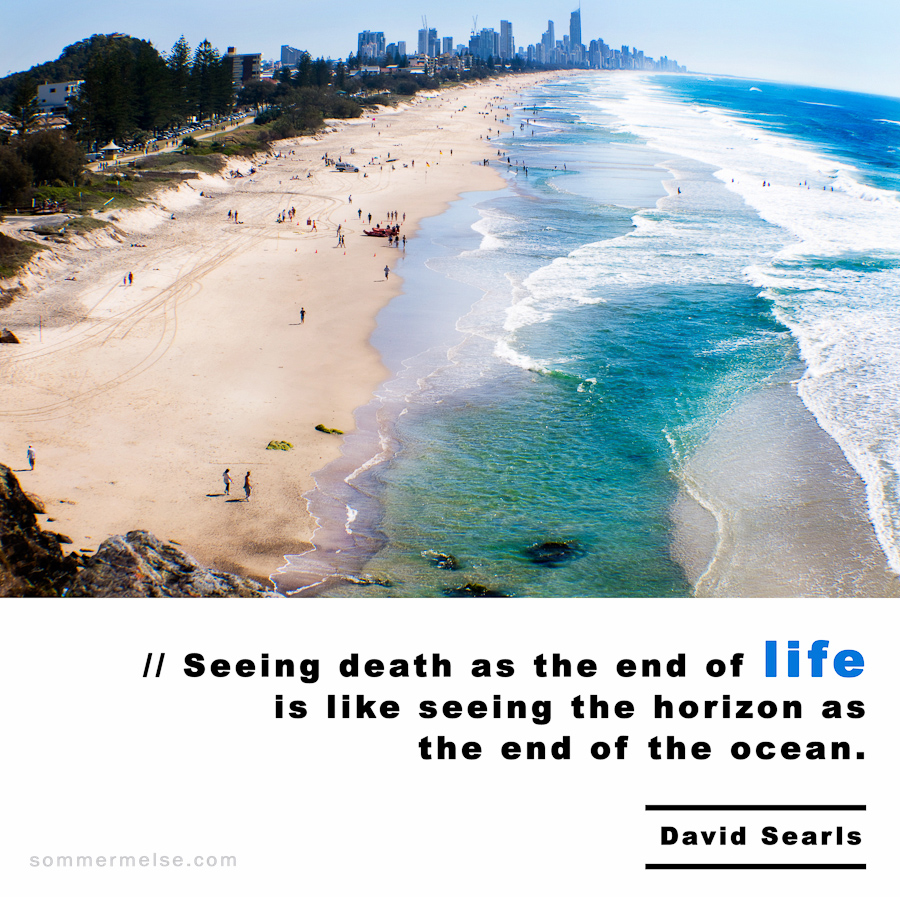 Quote // Seeing death as the end of life is like seeing the horizon as the end of the ocean – David Searls June 23, 2010 by sommer | 0 comment Leave a Reply Cancel replyYour email address will not be published. Required fields are marked *Comment *Name* Email * Website